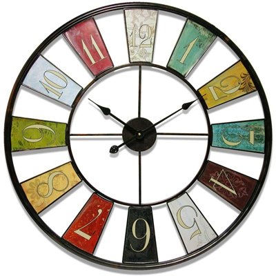 This impressive 32" diameter iron wall clock features black antique hands and a quartz movement.The colorful panels at each hour will go with a variety of decors