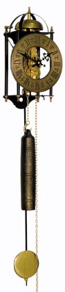 8504 Features: -Wall clock.-Brass dial with fleur-de-lis.-Cast iron weight.-Roman numerals.-Swinging pendulum.-Single bell strike on the hour.-Cage over bell.-Visible 8-day weight driven skeleton movement.Construction: -Frame construction: Wrought iron.-Finials, bell, gears, pendulum and chain construction: Brass.