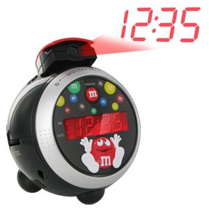 * 6"" red LED display* Projects time on wall or ceiling* M&M colorful character decoration* AM/FM radio* Wake to alarm or music* Snooze* A/C power with battery backup (1x 9V - not included)* Size 5"" W x 6.3"" H x 4.4"" DSpectra M&M's Character Have a Sweet Day LED Projection AM/FM Alarm Clock Radio Features