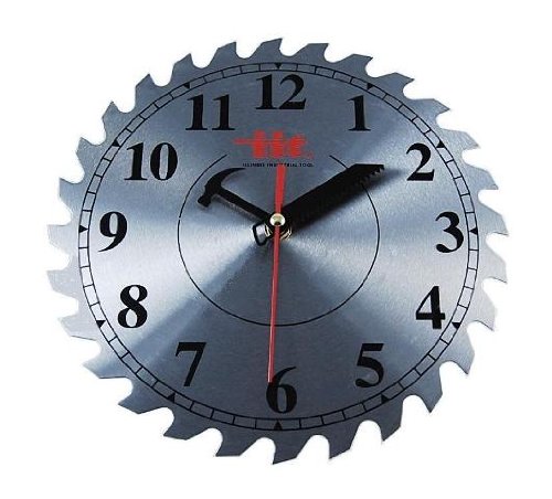 * Unique clock made from 10" circular saw blade - perfect accessory for any workshop * Hammer and handsaw hour/minute hands with second hand; Quartz-regulated movement * Built-in wall hangar; runs for months on one AA battery (not included) * Great conversation piece - a 'timely' gift for your favorite handyman * 10" diameter, 1-1/2" depth; 16 oz10" Sawblade Wallclock - Shop Clock Features